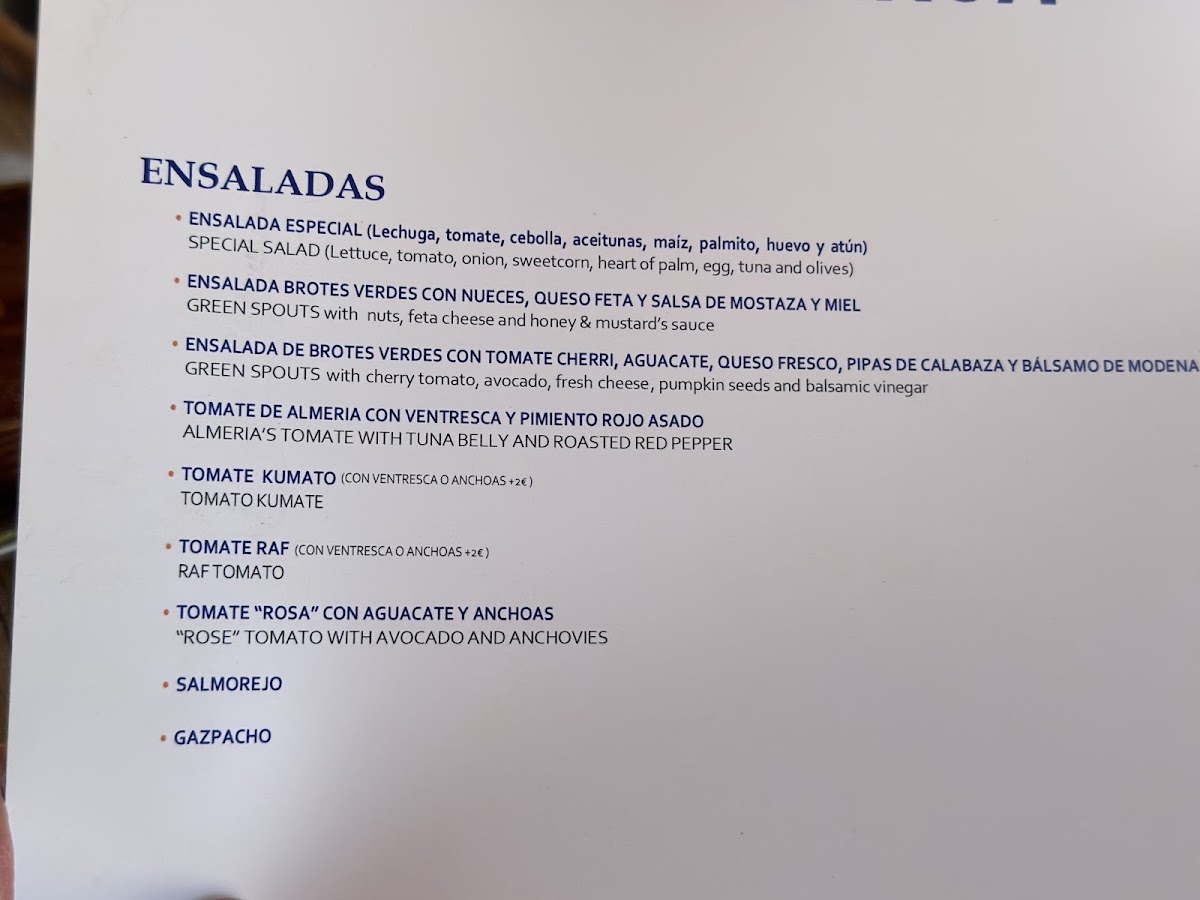 The menu at this restaurant and bar in Agua Amarga, Almeria, offers a variety of traditional Spanish dishes with a focus on seafood and rice specialties. Visitors can find classic options such as Paella de Mariscos, Arroz Negro, and Calamar a la Plancha, alongside a selection of fried fish such as Boquerones Fritos and Calamares Fritos. The menu also includes several tapas-style dishes like Almejas, Mejillones al Vapor, and Habitas Baby con Sepia.