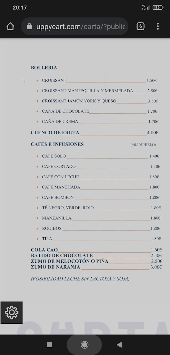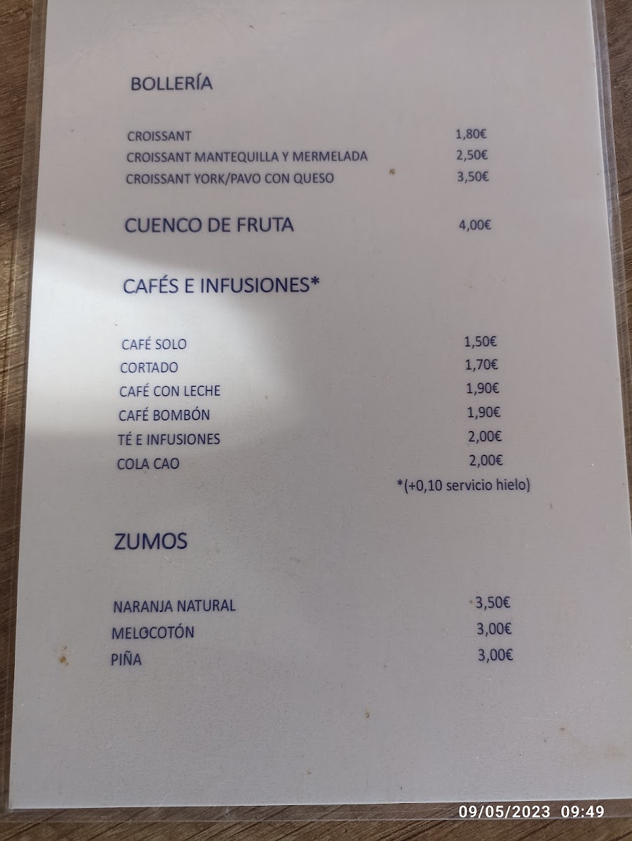 Food offerings are complemented by a range of beverages, including white wine (Vino Blanco), beer, and coffee. Desserts available include options such as Tarta de Queso and Mousse de Limón.
